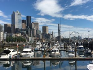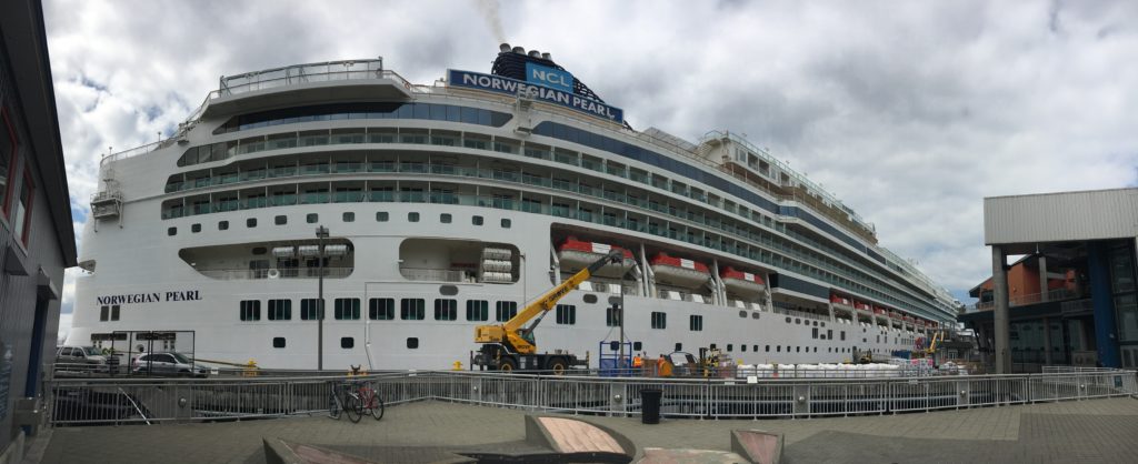 Since Wednesday we’ve been tied up at Bell Harbor Marina in downtown Seattle. We’ve seen three different cruise ships so far right here at the marina, first the smallish ultra-luxury Seabourn Soujourn with 450 passengers was here when we first arrived. Then on Saturday we saw the 2376 passenger Norwegian Jewel followed by the 2394 passenger Norwegian Pearl on Sunday. I spoke with a guy who was boarding the Pearl for an 8 day Alaska cruise and he was super excited.