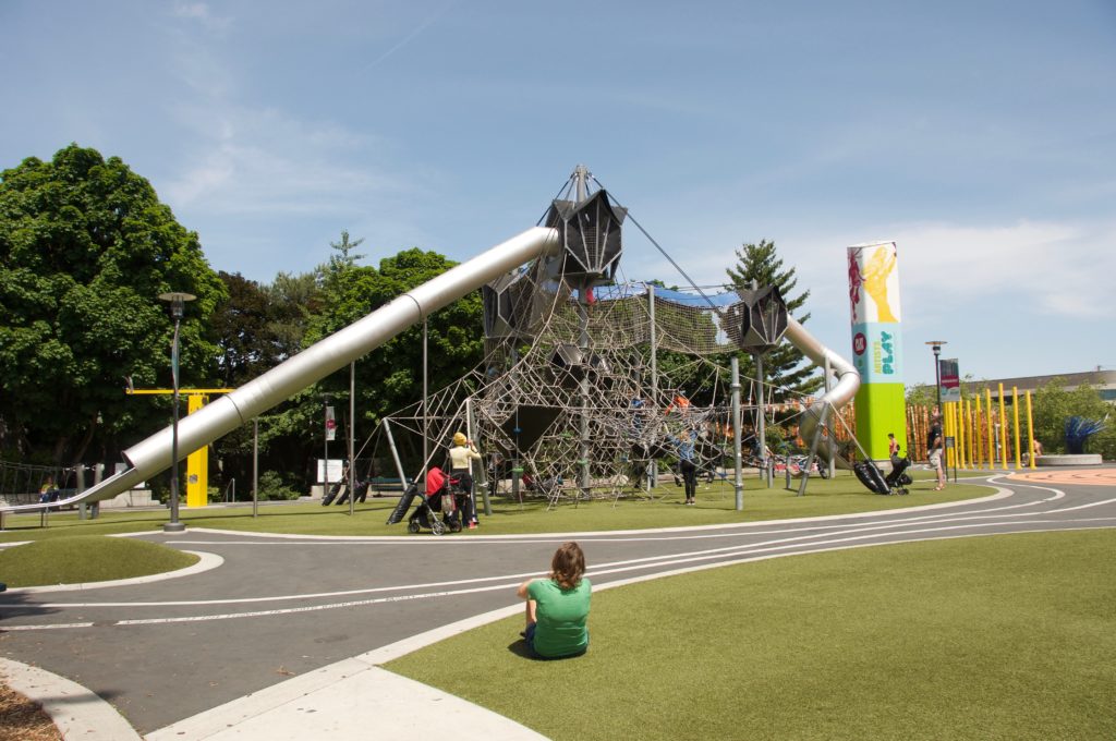 The Armory was built in 1939 as an Armory for the 146th Field Artillery Division and its tanks. Later in 1962 the Armory was renamed the Center House as part of the Seattle Center construction for the 1962 World’s Fair in Seattle. It was the first vertical shopping mall. It now houses offices for the Seattle Center, some theaters, and a large food court. Lunch was a mix of Mexican and Subway sandwiches. After that we walked out to the “Artists at Play” playground which is basically pretty awesome. The playground sits where the Seattle Center used to have some small amusement rides.