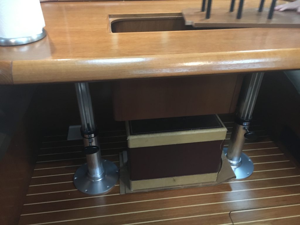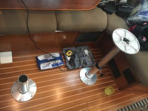 At anchor I recovered from the day a bit by just laying down. Then I decided I needed to replace the table legs. I opened the boxes, took the old table legs off and started checking things out. Both the old and new pedestals extend below the floor, however the new version with the gas strut requires a larger diameter hole in the floor. I really didn’t have the correct tools but I did have the Dremel (the actual Dremel brand in fact). I tried a cutting bit for a while but eventually I settled on the sanding drums, just running the sanding drum around the inside of the existing hole until the hold was large enough. It made a lot of sawdust, and it took a while, but it worked and I got the table installed in time for dinner. The new pedestals are SWEET! Where the old table would drop easily and be a bear to pull back up, the new table needs someone to sit on it to drop, but slides right back up on its own when you release the clamps.
