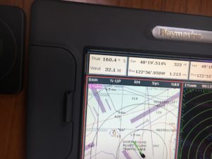In the end we made a gamble that if we followed the wind and waves into Haro strait, once we got some distance into that channel the seas would calm down. I was worried about the opposing current (we entered Haro at essentially full ebb tide, (the tide pushing opposite the wind) but the tide was only 1kt against the 35-40kt wind so we didn’t see any obvious standing waves. We did, however, find that the waves were larger, partially compressed by the narrow start of the channel we think, but the period between the waves got longer, making it more comfortable and easier to manage. Around the NW corner of San Juan Island we ducked in toward Mosquito Bay where the waves died to nothing, sheltered by the outer western edge of San Juan Island. The wind dropped as well, still moving 20+kts though. We headed into Roche Harbor and secured a slip for the night, figuring we’d move to Anacortes Friday morning. Wind peak on the display during our crossing was over 42kts.