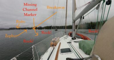 Once at Dundas Island, we slowed down and did a small amount of fruitless fishing outside Brundige Inlet before we entered the inlet for the night. Entering Brundige we snaked through a tight passage to find the other boats anchored in a very pretty and calm bay with a shallow mud bottom—seemingly perfect. Unfortunately, several crews found that the whole place is infested with biting flies. Several crew were attacked on land when they took their dogs and a few of them had swollen ankles, hands, fingers, and/or eyes as a result. Devon barely made it back into the closed cockpit to spare herself after dropping the anchor. We kept the cockpit enclosed completely and stayed on the boat the rest of the night. Devon played piano in the cockpit after dinner and we went to bed, preparing for the LONG motoring day to Ketchikan the next day. The fleet joke for Brundige was that the reason no one saw any signs of animals on shore was because the bugs ate them all. I realize now that I don’t have even a single photo of Brundige. Oh well.
