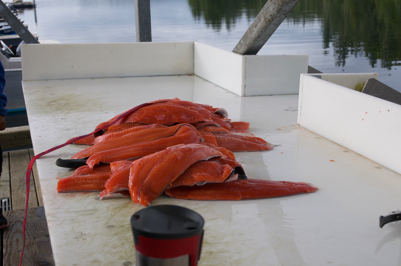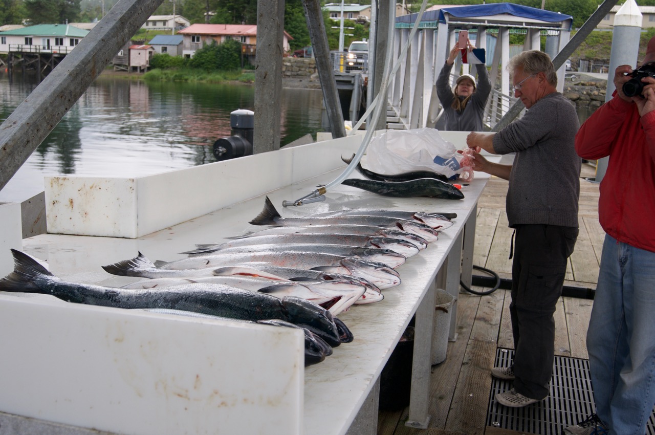 The docks in Hydaburg are very nice, build only about two years ago, including a nice large fish cleaning station. The locals helped our crews clean and filet a couple dozen salmon, even showing us how they filet very quickly.