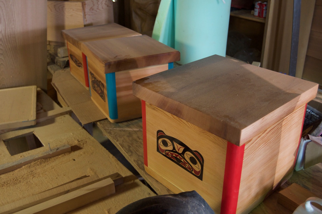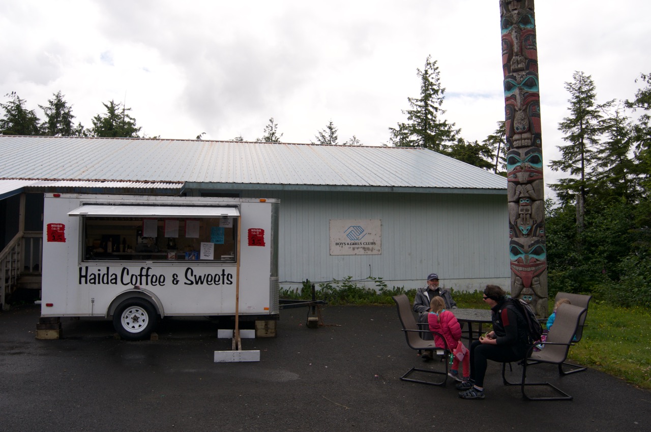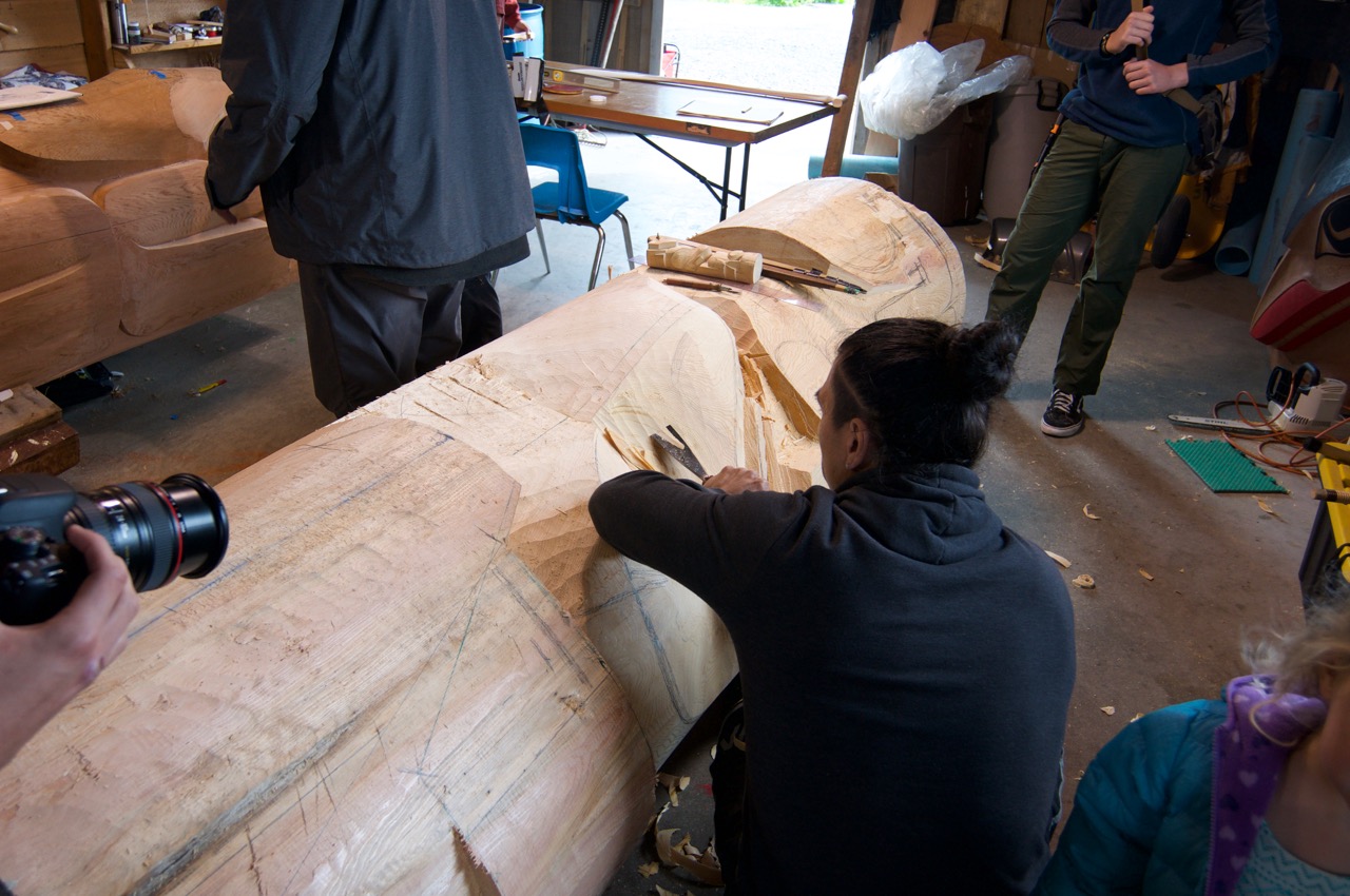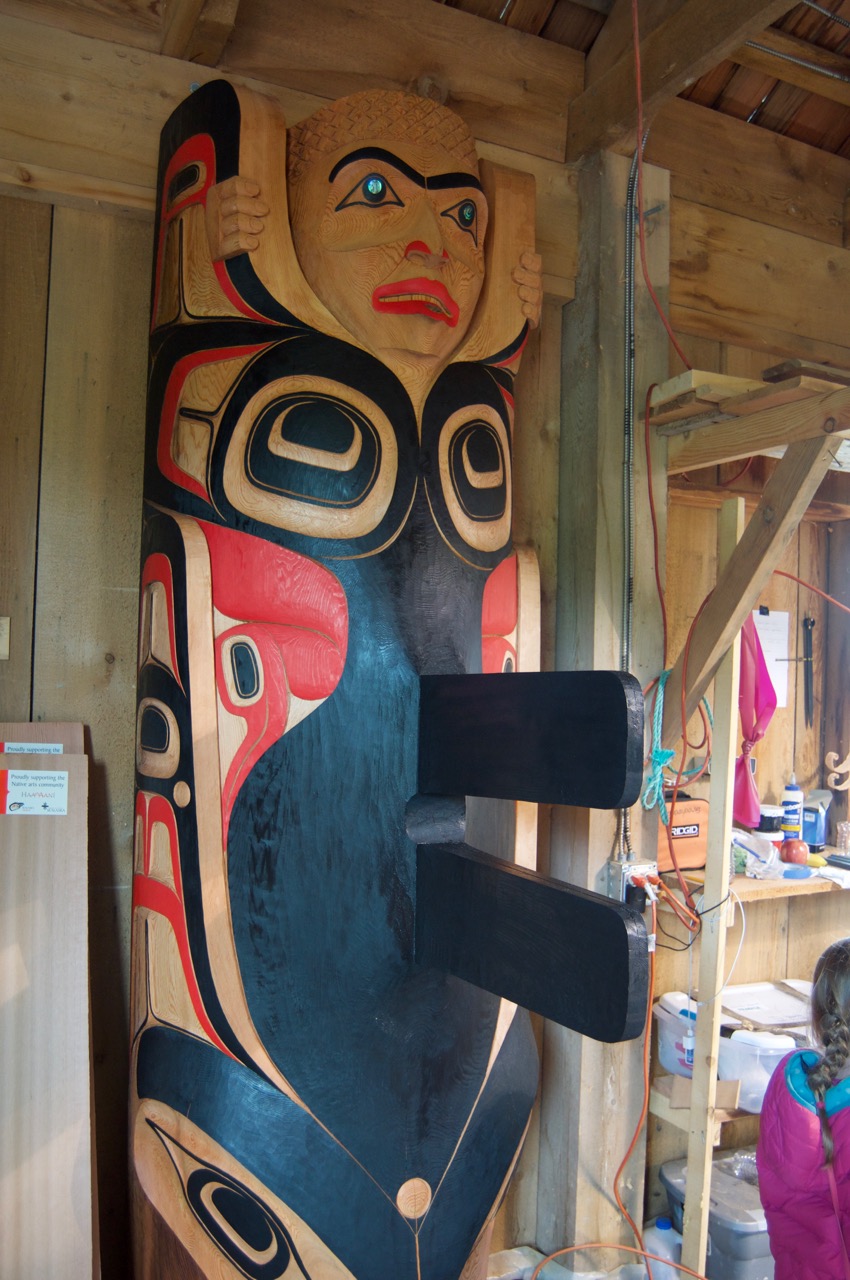 In the morning, Devon watched Jim Rard prepare the roe from salmon, making an instructional video for the process, then we walked to town to see the carving house. It was really cool to see the young men create new totem poles, paddles, and other carvings. Haagoo told several Haida stories, and some history of the town, especially how the mayor has been working on cleaning up the typical broken down cars, trash, and other detritus you see in poor towns, applying for government grants (ie: the new docks, longhouse, etc), and encouraging the children to learn the Haida language, woodcrafts, and other skills to keep the culture alive. Haagoo himself talked about how in the past the locals would run visitors out of town, and he’d be one of those same locals, fueled by hate of the government, integration, and alcohol. But he’s sober, and the town is doing everything they can to encourage visitors to learn about their traditions, including allowing cameras and video of their stories and carvings, something they wouldn’t allow in the past.