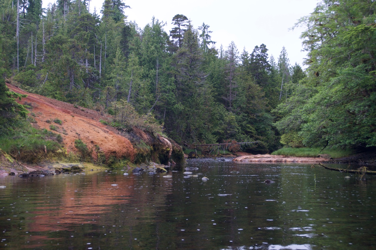We anchored in 24ft of water in Soda Bay, unfortunately in the rain, but we took the dinghy over to the creek anyway to see the mineral deposits from a soda spring. The deposits seemed to come from everywhere, down the hills on both sides of the creek. Throughout the creek, we could see bubbles coming up from the bottom, with several warm spots as well. Really quite fascinating.