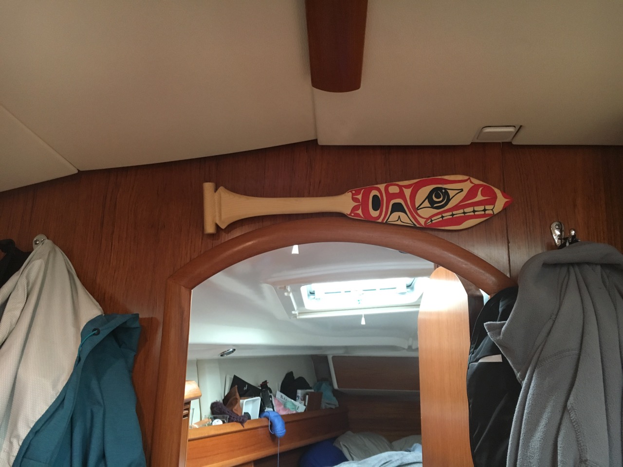 In the morning, my bum toe was bothering me a bit too much to imagine taking on today’s hike in the woods, so I opted out. I spent the time doing dishes, trying to organize the boat a bit more, finding permanent homes for a few more things, vacuuming crannies and nooks, cleaning the aft head, and finally taping the anti-slip mat to the bottom of the salon rug. I even mounted the Haida paddle on the bulkhead above the forward cabin door in the salon. The Orca is the protector of seagoing people from sea monsters so I figured a location over our heads in the salon would do well.