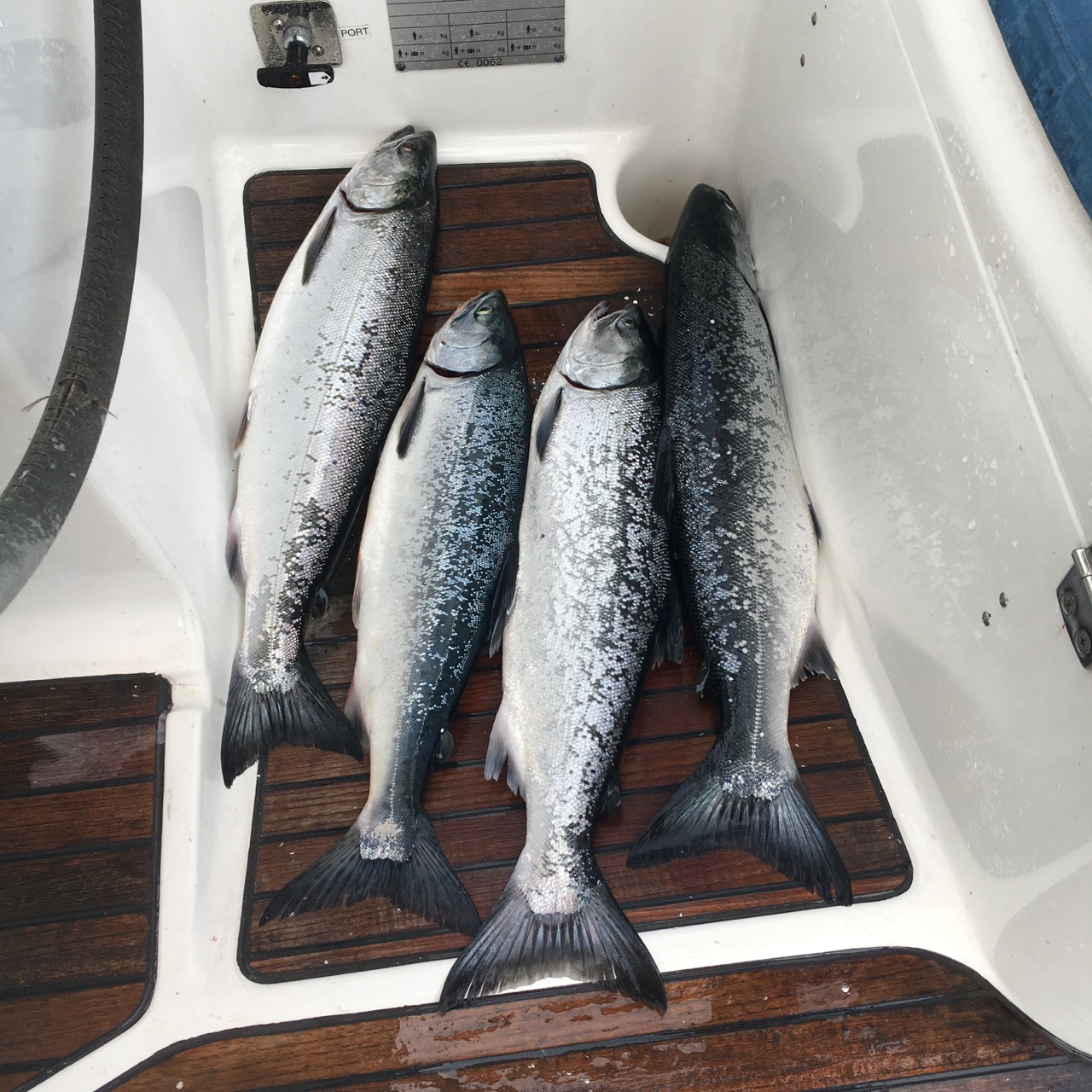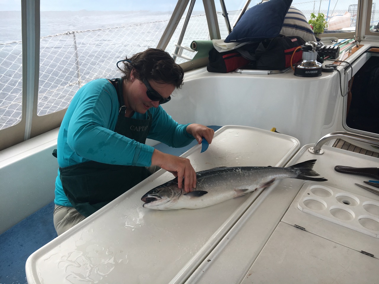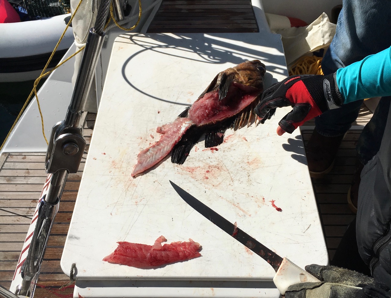 By 10, the girls are generally settled, and they get busy reading or playing on their iPads. They get 2 hours each day, and only when we’re underway. For the parents, it’s time to start fishing. We find a good spot, and spend about 20 minutes getting the lures all set up, before we finally get them in the water. There’s usually a fish on within the hour, and Rich and I have developed a good system for getting them in – one parent reels while the other nets. When there isn’t a fish on, we’re keeping watch, planning routes, filleting the last fish, and cleaning up the cockpit and boat.