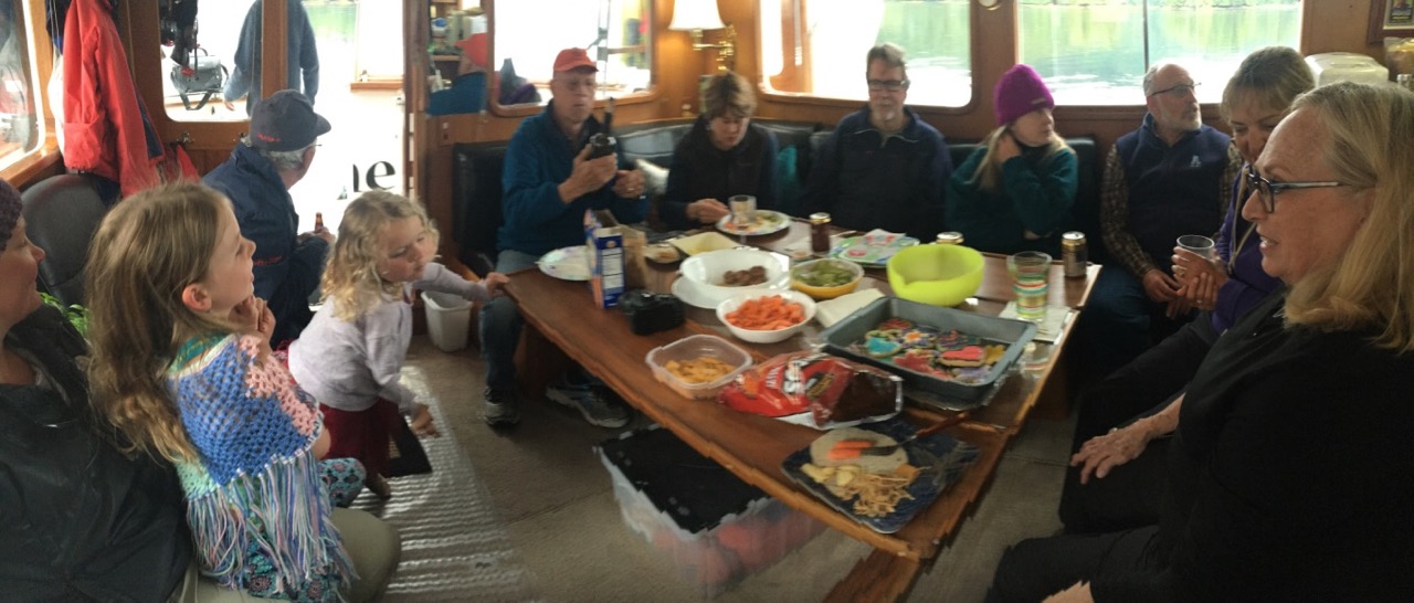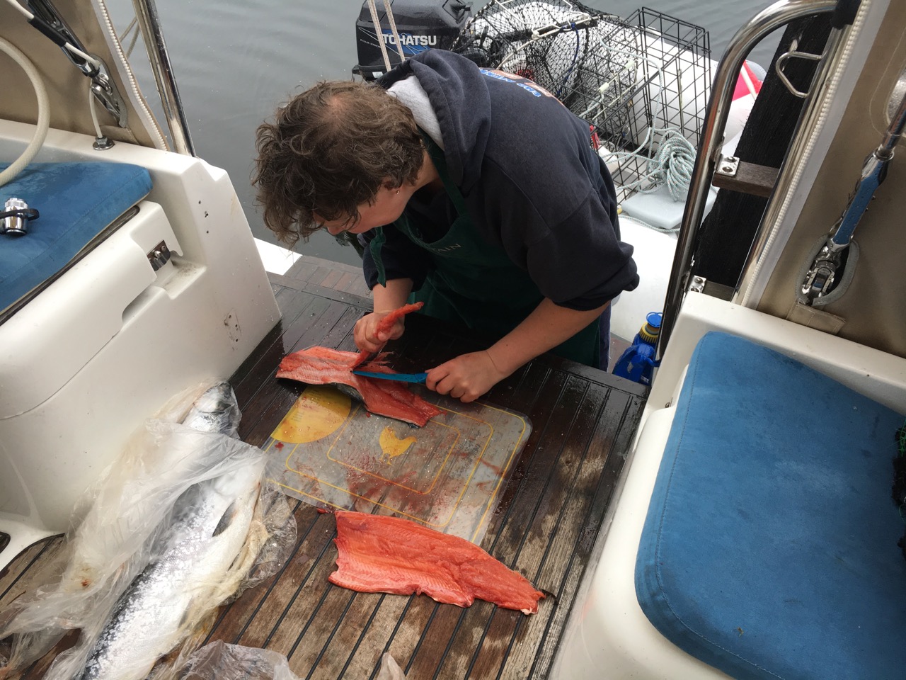 By 11, we’re getting hungry, so one parent keeps watch and continues fishing while the other makes lunch. Most days, it takes almost 2 hours to make lunch, get it all served and eaten, and then clean it all up. Sometimes, this is because we’re interrupted by bringing salmon on board; sometimes it’s wildlife viewing, including Whale Watch and Bear Watch; and other times it’s just because 4- and 6-year-olds have the attention span of a newt.