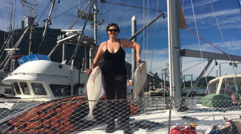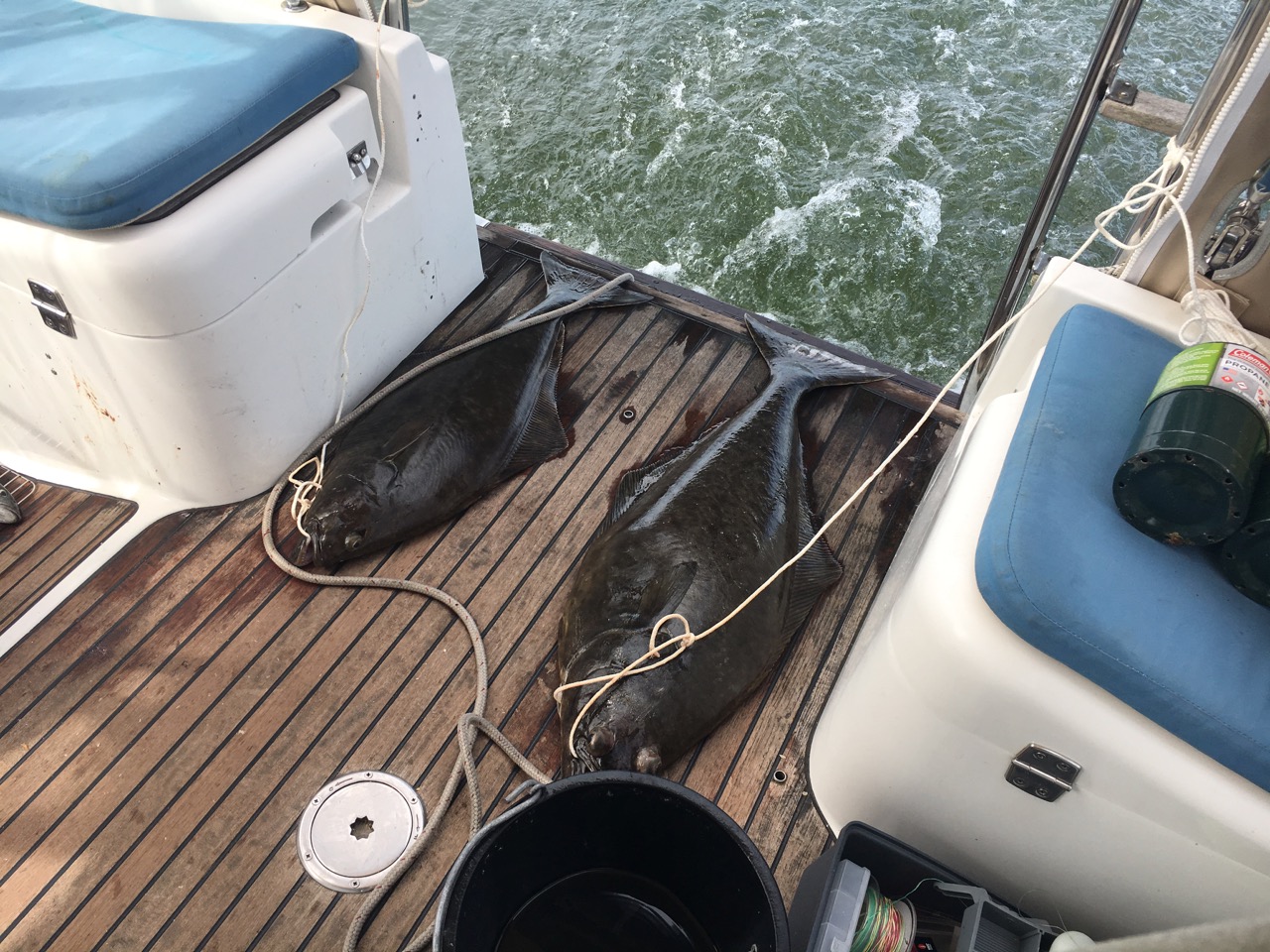 Jealous of his haul, and, I admit, a little competitive, I was then determined to catch a halibut. I wasn’t at all confident we could bring in a 5-foot halibut, but something more manageable would satisfy my competitive spirit. Our first location was a bust; I failed to notice the markings on the chart for grassy bottom, and we pulled in two small sculpin. Our second stop, however, yielded 3 halibut on the hook, and two in the boat. (The second halibut got away while we were trying to net him.). With a 29-inch and 35-inch halibut sitting in our helm’s footwell, and afraid of getting anything bigger if we kept fishing, we pulled up and moved on.