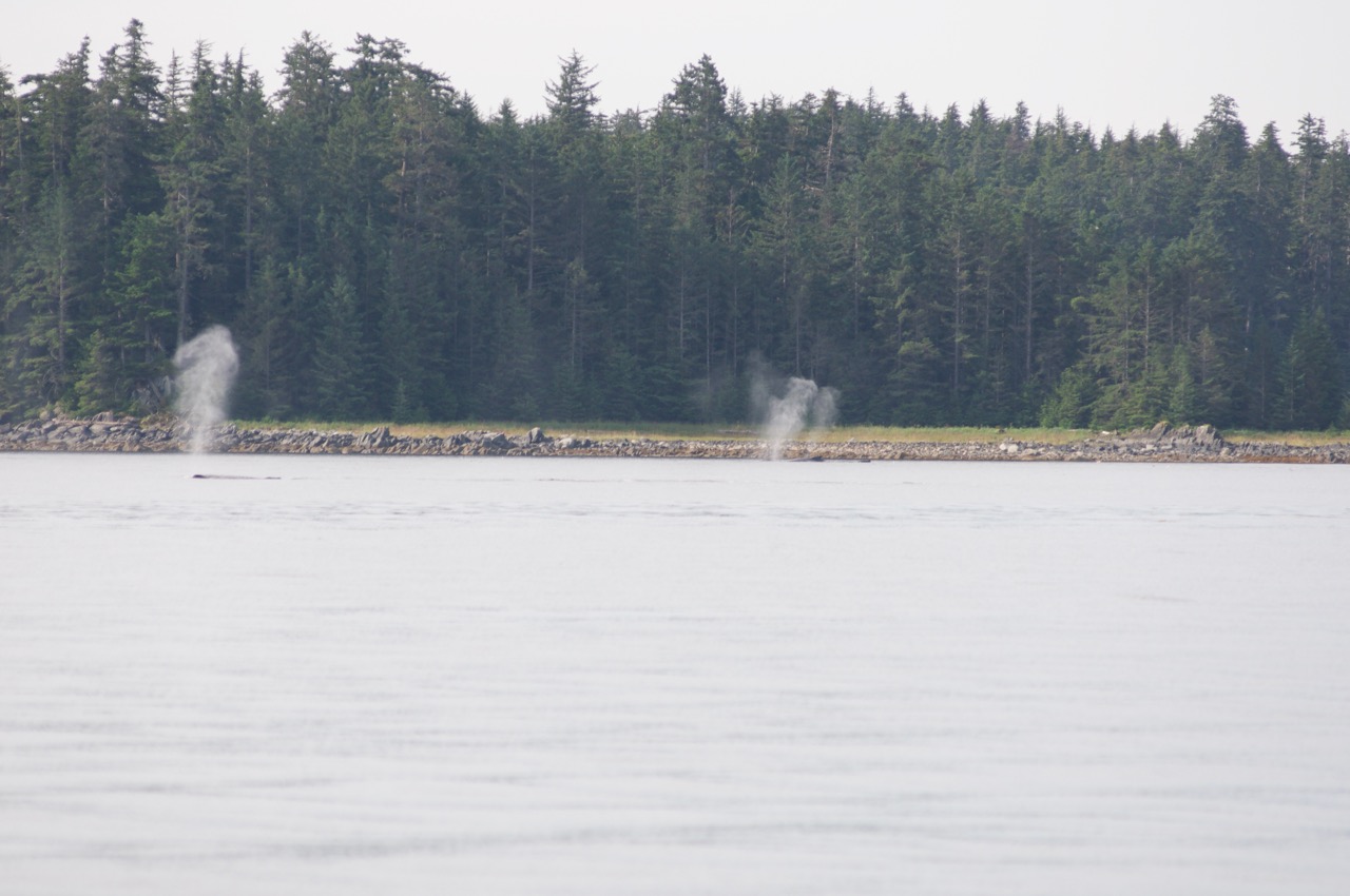 They clearly had no sense of urgency, as it took them at least 10 minutes to move through the channel far enough for me to proceed behind them. I waited until the spouts stopped appearing for several minutes, and then cautiously navigated the rocks. Just as I passed the last rock, spout appeared in front of me, followed by a large hump. Again, I put the engine in neutral. I waited, and watched, as the whales again meandered along across my path, shifting into reverse as needed to give them their space. After another several minutes, the spouts stopped, and I again made way, this time down the channel to the south.