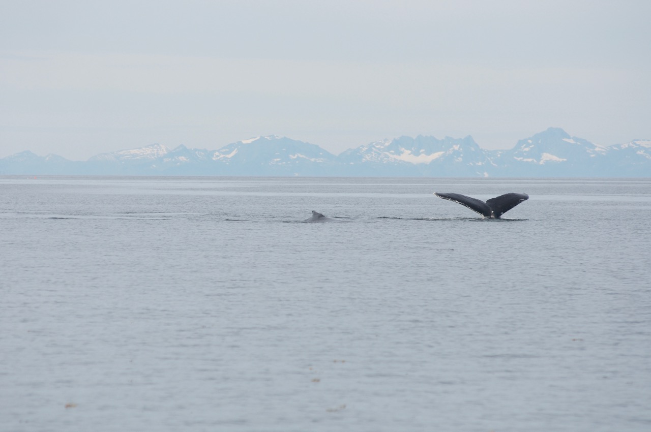 Humpbacks were plentiful during our morning cruise; in the first fishing bay, we watch a family of 6 humpbacks bubble feeding just off the coast. Then, as we left our second, successful fishing hole, we all but ran over another pod of three or four. We also encountered a large school of porpoises.