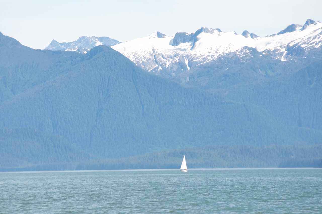 I had my hopes set on also catching several salmon on our way south, so that we could pack them up and send them back to family when we arrived in Petersburg, but the run was too long to justify the slowdown. Instead, we simply motored on, enjoying our lunch in the cockpit in the warm sun. We had halibut we could send home if we were able to find the means of doing so, and we still had several fillets of salmon in the freezer as well. (Unfortunately, although Petersburg has an entire business devoted to freezing, packing, and shipping sport fish, we ran out of time to send any.)