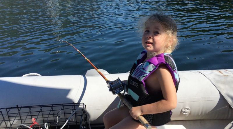 I didn’t catch anything that morning, because it hadn’t been more than a few minutes when Ellie popped up. She wanted to fish. I happily handed her the pole, but she rejected it. I didn’t understand the problem. She started climbing into the dinghy at the back of the boat, off the swim step. Wait, what? She finally explained that she wanted to fish from the dinghy. I suppose that made sense. We got her life jacket on, and she took over fishing duty. Which lasted about two minutes.