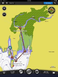 But I didn’t, because we had a destination in mind. We were going with the dinghy fleet to pick berries in the estuary. Besides, the tide was coming in, so all we had to do was make it around the corner, and the tide would pull us right in. Then, in an hour, the tide would switch, and it would push us right back out. I’d barely have to paddle. Plus, it didn’t look that far on the chart. But still, that first half mile out to the point was a long paddle, farther than we’ve gone in a single trip so far. We should have taken baby steps.