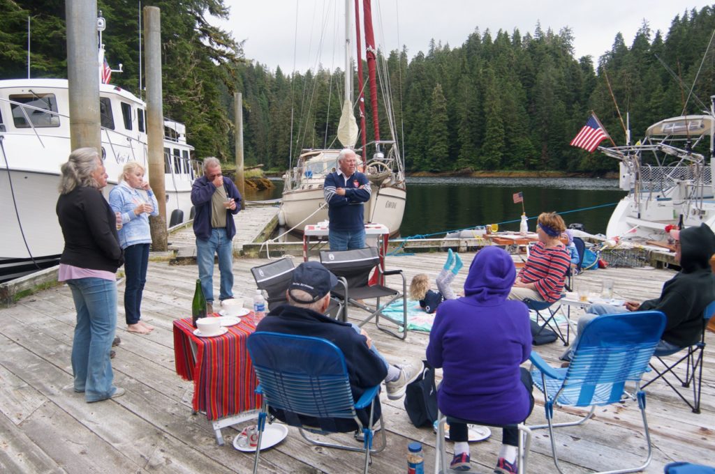 Morning in Loring was lazy. We eventually got dressed and moving, coming out on the dock for visiting with the other boats. About mid-day Jim decided it was time to “fix” the rafting situation and covert it to a med-moor setup. So we released the lines from Sea Pie and motored out of the way. Sea Pie untied from Foxy and motored out of the way as well, then Foxy moved out. After that, Sea Pie started first, dropping anchor 20 degrees to starboard and backing up to the dock. Foxy dropped their anchor directly off the bow and backed up along side Sea Pie’s port side. Then we dropped our anchor about 20 degrees to port and backup along side Foxy. All said and done we had 153 feet of boats tied to 45 feet of dock space, with everyone having direct access to the dock from their stern.