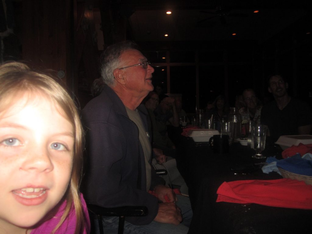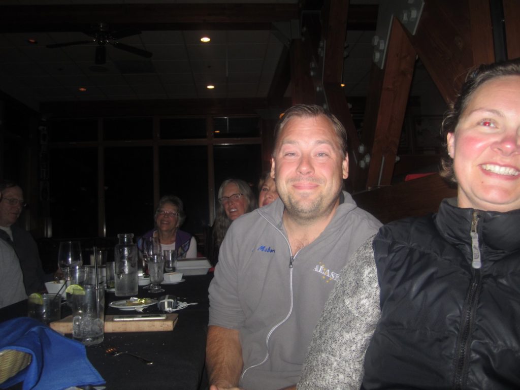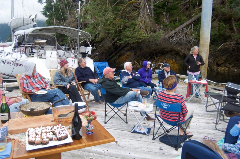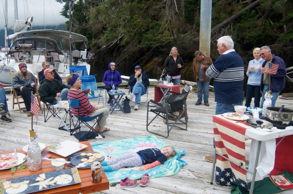 The Loring stop would be our last flotilla mooring before Ketchikan where Sail Alaska officially ends so it was time for another cocktail hour and potluck. Ruby Slippers, Sea Pie, Foxy, Mobert, Corvidae, and Lori Lee — 6 of the 12 original boats. It was another fantastic feast, including the awesome focaccia bread Vicki from Sea Pie made. The next morning each bot departed one by one toward Ketchikan, the weather turning from the sun we have had for the last week or more into dark, cloudy, and drizzly. As we mooted toward Ketchikan it got progressively wetter and we tied up to our slip in 15knots of wind and heavy rain. We hunkered down in the boat to stay dry until it was time to head downtown for the group dinner. Since our experience at Dwyers last time was lackluster at best, we decided to try Fox Hill instead. This also happened to be a celebration for Jim’s birthday which we had all apparently missed on the 9th I believe. At Fox Hill we had a wonderful group dinner, with Grady presenting the gift of a chuck wagon feast on his ranch in Alabama to Jim. We taxied back to Bar Harbor Marina, got the girls to bed, and crashed.