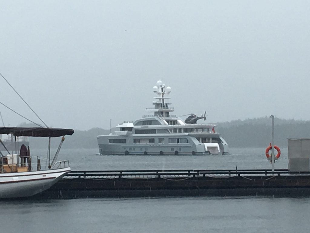 We spent a whole day at Prince Rupert, aka Rainy Rupert, where it rained all day. The Thursday gale came through and blew a ton of wind in Prince Rupert harbor as well as out in the open water. Prince Rupert Coast Guard and Prince Rupert Traffic radioed gale warnings all day, suggesting anchored vessels have a second anchor ready. The 237 foot yacht CloudBreak, complete with custom helicopter, sat along the breakwater, deciding in the afternoon that they should move closer to the airport (in the gale) so they could land the helicopter (in the gale) to bring the owner and his guests on board (in the gale). Unfortunately the professional local pilot on board forgot to radio Prince Rupert Traffic and about 50 feet off the breakwater they got a call that was not literally, but pretty close to “What the hell are you doing, where are you going, why didn’t you tell us before you departed.?” After apologizing, the skipper explained their plans (landing a helicopter on the deck of a yacht in a gale) they were offered two official anchorages to choose from, eventually settling on the second one due to the first having little to no wind protection.