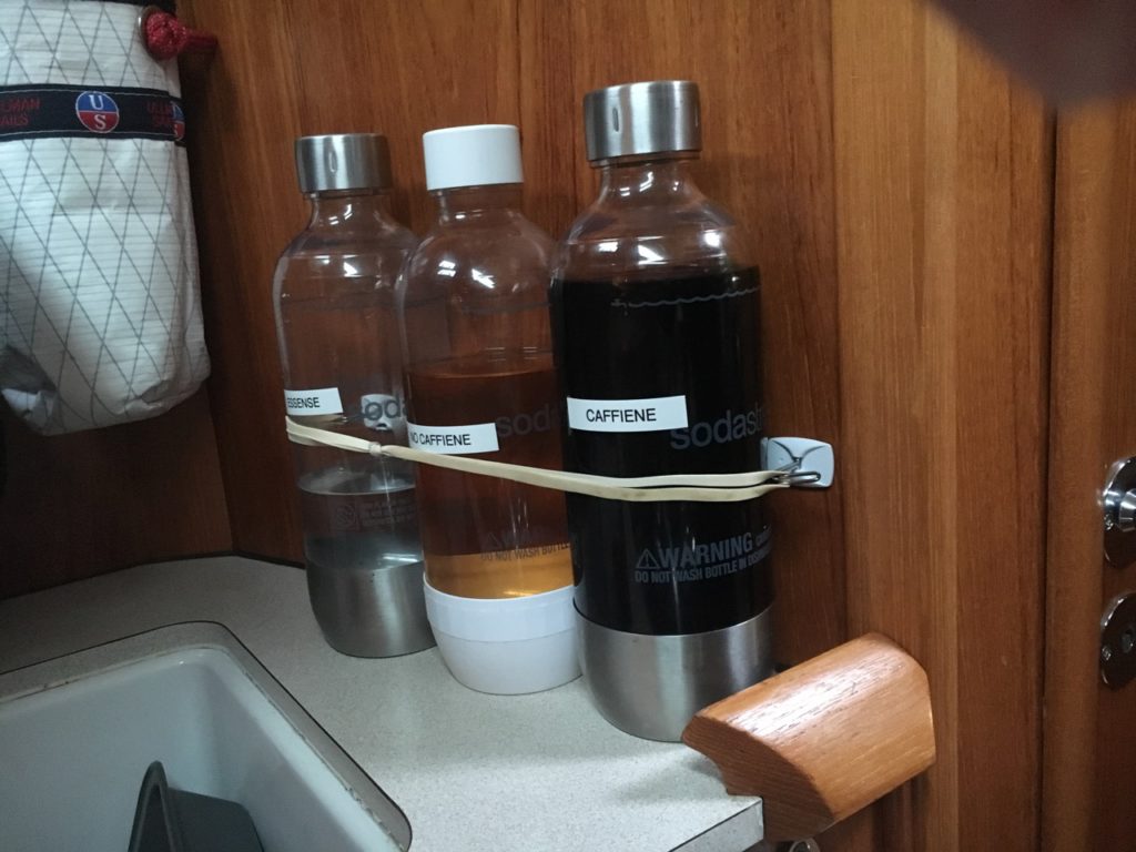 John from Breakaway wanted to fish, as did Devon, so John joined us on the way to Butedale while we slowed down and trolled for a few hours. Breakaway can’t troll since slowing down below 5.5 knots causes the transmission to slip out of forward, with no promise that it can get back IN to gear. While we fished, I stayed below, making lunch and trying to find new ways to organize the galley. 3M Commandhooks to the rescue with lots of ways to use the little hooks and removable adhesive pads.