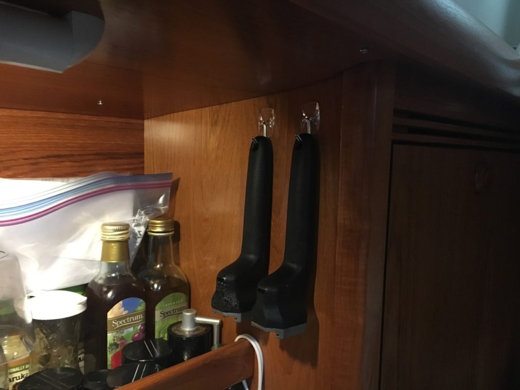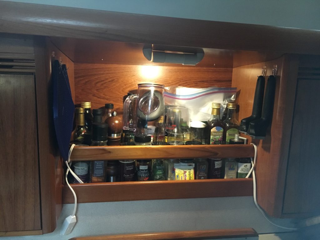 John from Breakaway wanted to fish, as did Devon, so John joined us on the way to Butedale while we slowed down and trolled for a few hours. Breakaway can’t troll since slowing down below 5.5 knots causes the transmission to slip out of forward, with no promise that it can get back IN to gear. While we fished, I stayed below, making lunch and trying to find new ways to organize the galley. 3M Commandhooks to the rescue with lots of ways to use the little hooks and removable adhesive pads.