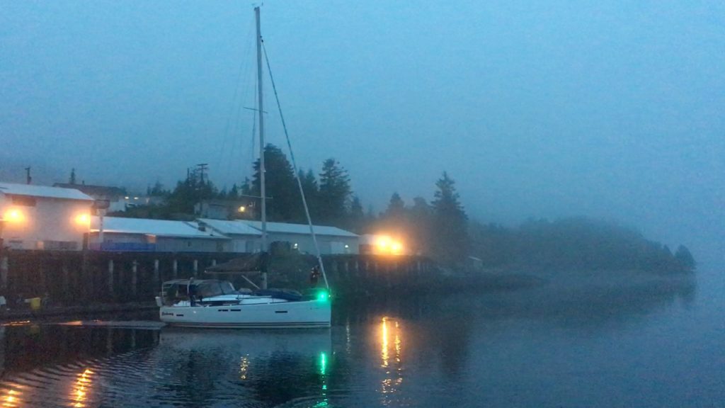 We navigated in the dark and fog for a while, sometimes dodging a new log every 5-10 seconds, until we made it into Milbanck Sound where we found no real wind, maybe 5 knots. There was a bit of swell but nothing much. We rounded the point and headed west into the channel toward Shearwater, with following seas and light wind from behind, arriving in Shearwater about noon. We tied up to the dock, hooked up to power, and sat back for few minutes to relax. We also discovered that Sea Pie, and later Lori Lee were in Shearwater at the same time which was super fun.
