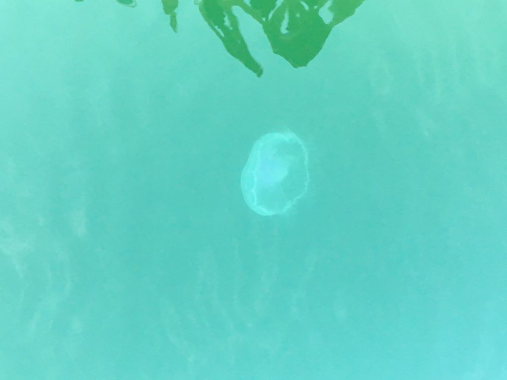 Our crab fishing efforts here were unsuccessful. Our first evening, we caught three small dungeness, about three inches each. We returned them to their ocean home and put the pot down again, hoping to find those crabs’ bigger siblings overnight. When we pulled the pot up in the morning, it was empty except for our bait fish’s skin and bones. A few large moon jellies joined the pot for the ride back up. There wasn’t a good place to set the prawn trap, so it stayed aboard.