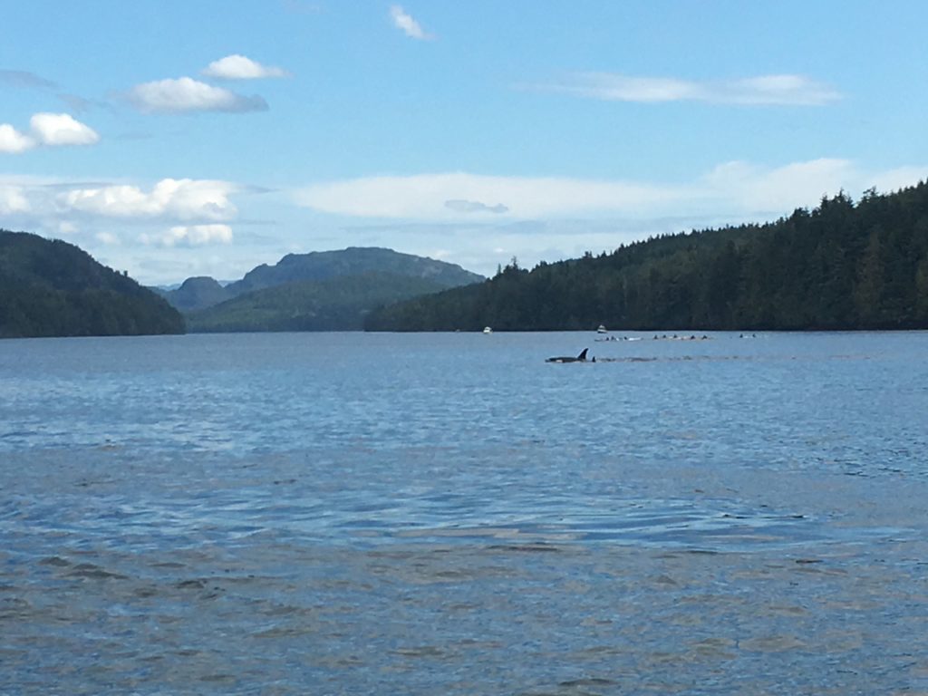 After our little kayak tour of Joe Cove, we pulled up anchor and headed back out of the cove and the marine park toward Blackfish Sound. In Queen Charlotte Strait, a small group of humpbacks swam along in front of us. Then, in Blackfish Sound, we were quite pleased to encounter something we haven’t seen in a while – blackfish! A large pod of orcas was busy hunting among the sport fishing fleet off Parson Island.