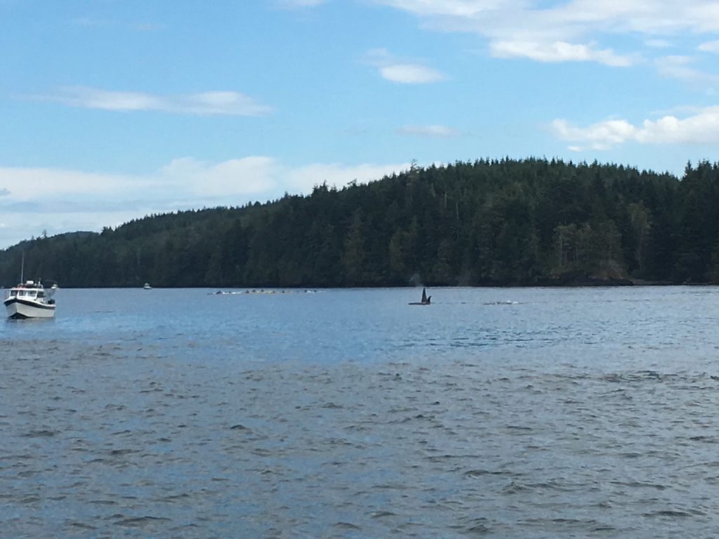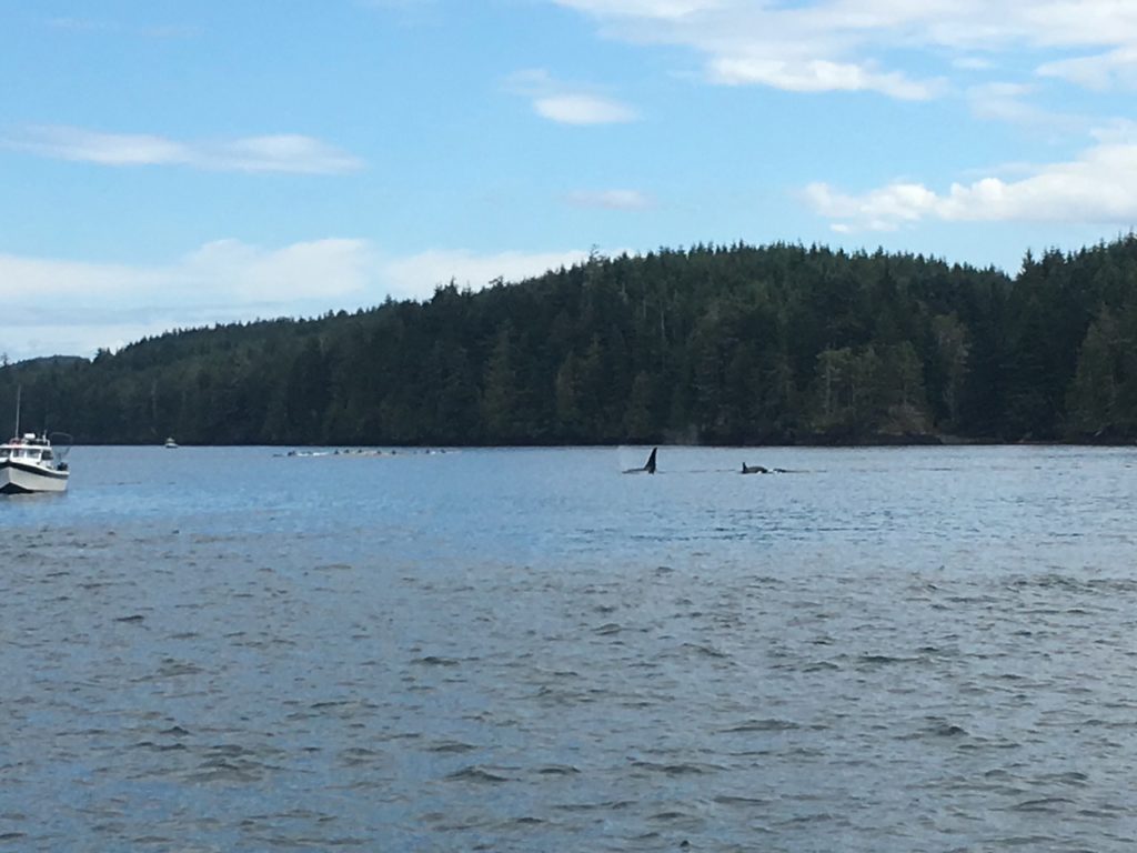 After our little kayak tour of Joe Cove, we pulled up anchor and headed back out of the cove and the marine park toward Blackfish Sound. In Queen Charlotte Strait, a small group of humpbacks swam along in front of us. Then, in Blackfish Sound, we were quite pleased to encounter something we haven’t seen in a while – blackfish! A large pod of orcas was busy hunting among the sport fishing fleet off Parson Island.