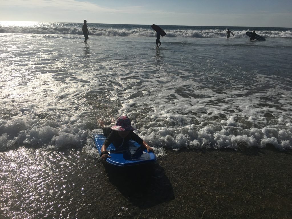 What followed was a six-hour boogie boarding extravaganza. They absolutely loved riding the surf into the beach, and picked it up within the first 30 minutes with veteran surfer Uncle Dana’s help. It wasn’t long before they ditched their life jackets for more freedom. Around noon, I walked down to the sandwich shop down the street and brought back an assortment of sandwiches for our group to share. We managed to get the girls out of the water long enough for, oh, maybe three bites, before they tore back into the surf. For six hours, they ran out into the waves, rode them in, picked up their boards, and ran back out again.
