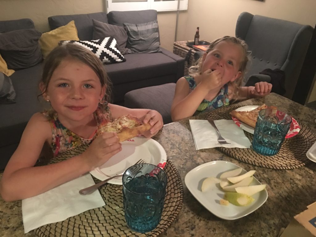 By the time we got the girls out of the water, the sun was starting to get low. We headed back to the apartment again, and again the girls were excited for a bath. They needed help washing their hair, and they wouldn’t let me near them – only Aunt Cindy was authorized to help. She was fabulous, and treated the girls like her own grandkids, and by the end of the three days the girls absolutely adored her and Uncle Dana. While the girls bathed, Rich and Uncle Dana walked to pick up pizza and sangria.