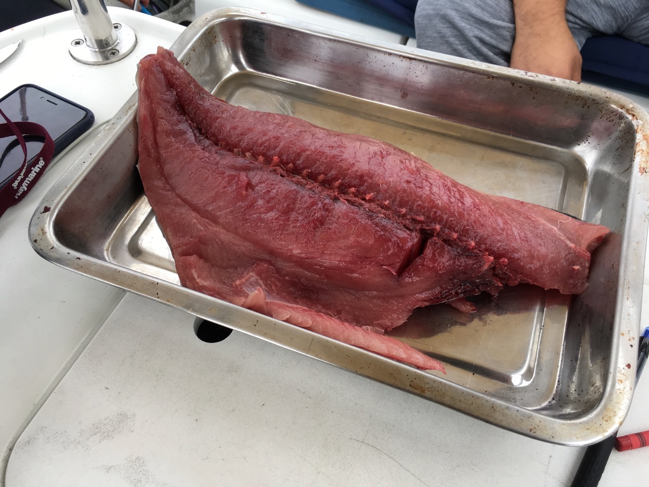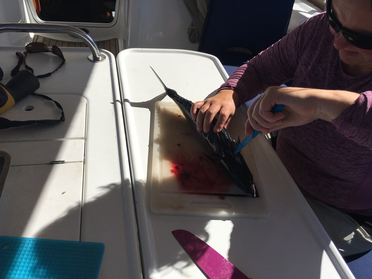 Soon after, Jason pulled in several bonito on the hand line. I had filleted all the other fish, which is quite the chore on our boat. If we had a fish cleaning station in the aft on top of the Yeti cooler I want, filleting our fish would be easy – but as it is, we have to sit on the floor and fillet it in the wheel well, so that the blood can drain out the scuppers. It requires long periods of kneeling and bending over, and is rough on the legs and back. Most of the time, my legs fall asleep doing it. So, Jason filleted these three. We’d never had bonito before, so we lightly seasoned it up and put it on the grill. It was delicious. The texture makes it a fish not particularly prized, but the flavor is excellent. So, we put out the lines looking for more.
