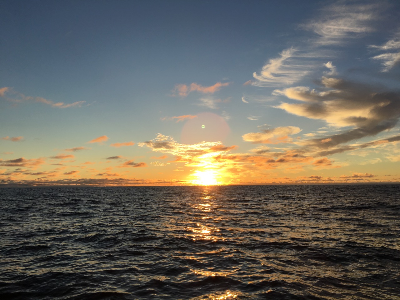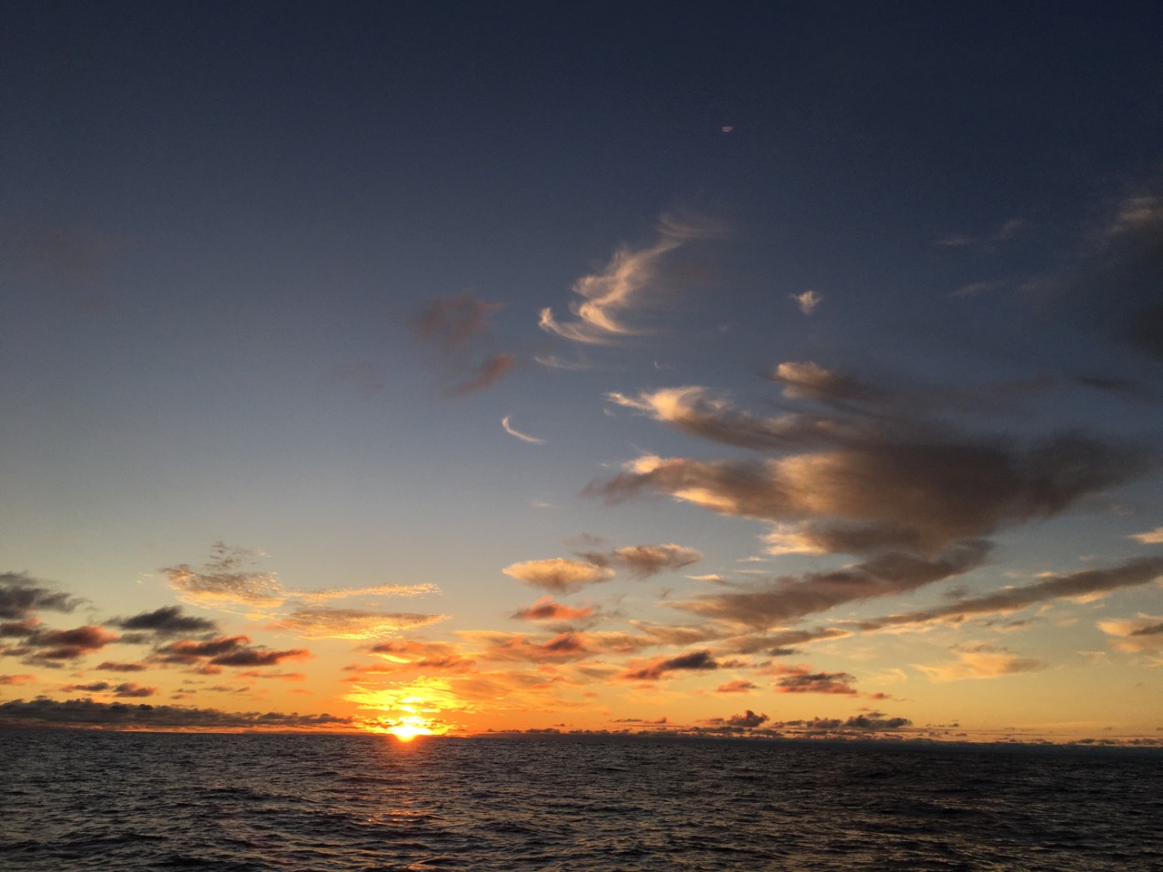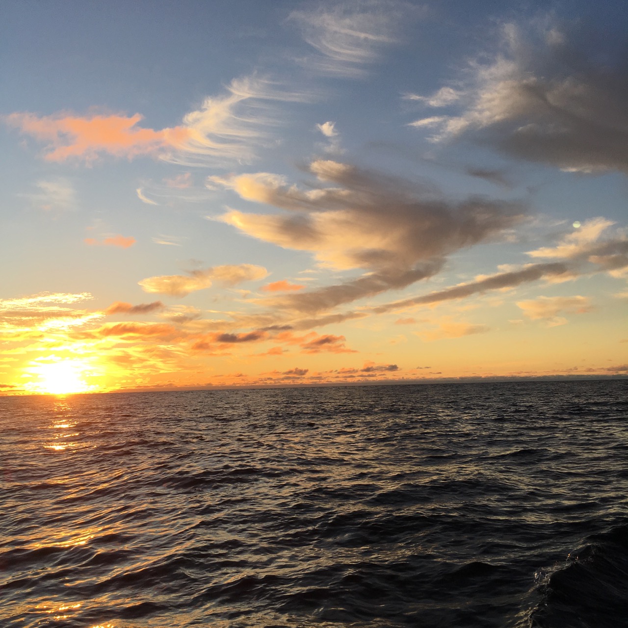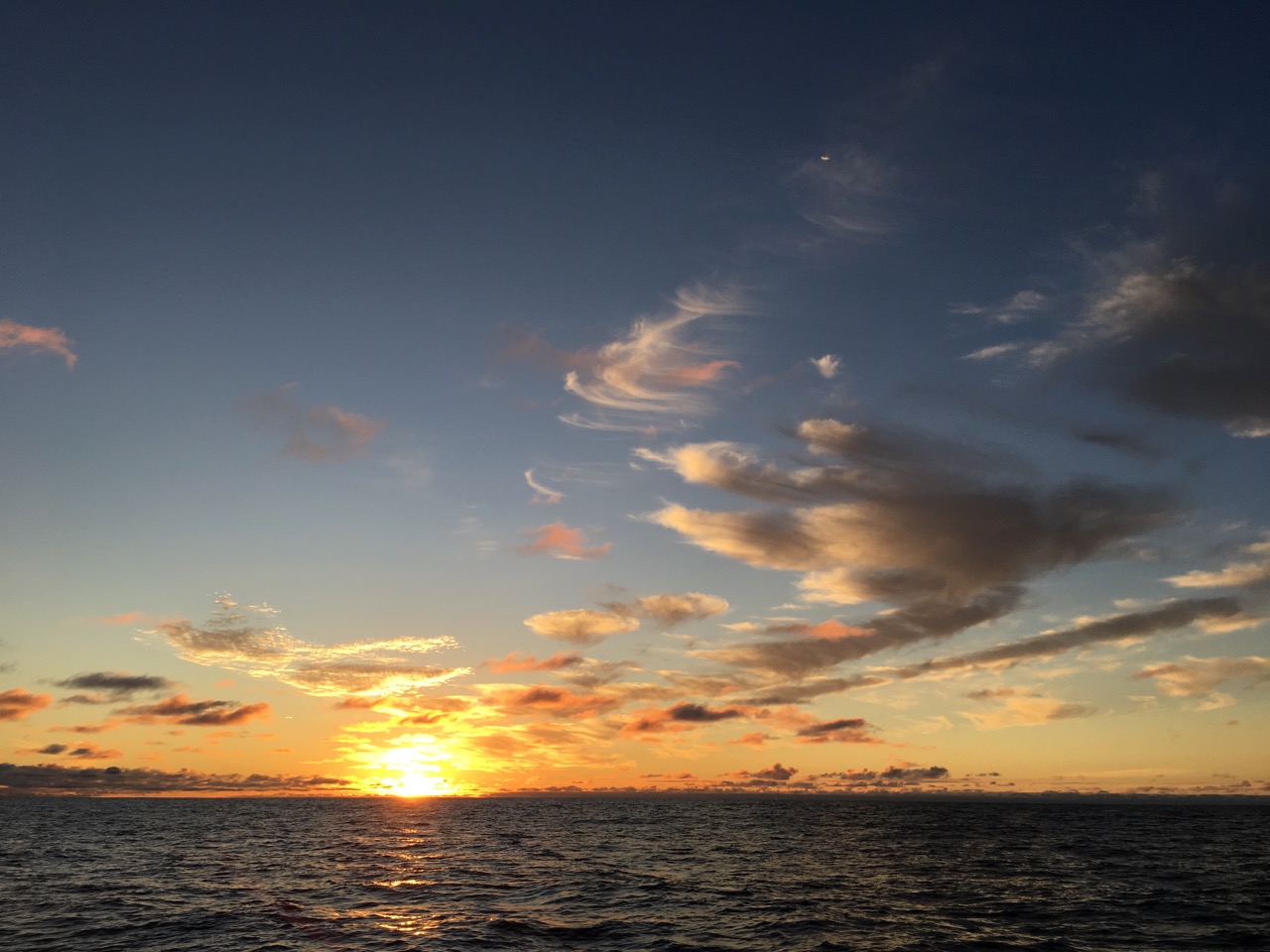 Unfortunately, there still wasn’t any wind, so we continued to motor all day and throughout that second night. The day was grey, uneventful, lacking wind, and overall slightly depressing. After a very satisfying sausage and sweet potato hash for dinner, Rich went to bed early to take the swing shift, midnight to 4AM. Jason took the first shift, 8PM to midnight. I stayed up until 8 to put the girls to bed, and then went to bed myself so I could wake up at 3:45 for the 4AM – 8AM shift. For the second night in a row, I didn’t sleep well.