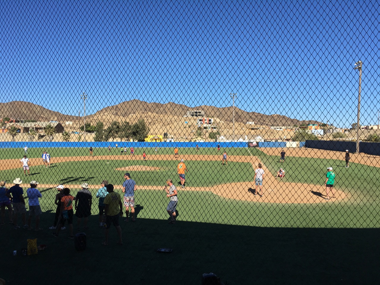 The plywood and missing walls made the baseball stadium seem completely out of place. It was a beautiful, freshly painted concrete grandstand structure, with a bright green astroturf field crossed with fresh chalk lines, and a brightly colored team logo in the outfield. At the concession stand, everything from candy bars to chips to beers was $1 each. We watched as the local kids and cruisers swarmed the field, with well over 20 fielders in place at any given time. Meanwhile, the batting line-up was over 30 people long, and thanks to some convenient technicalities, no one ever struck out or walked – every hit was at least a base hit. After a few hours, the local kid outfielders were apparently bored, and huddled together behind second base, throwing their gloves up in the air. At some point they must have started a push-up contest, but despite the distracted outfielders, the game went on. It was near the end when Morgan and Ashton finally decided to take a turn at-bat, and boy was Morgan thrilled with the experience. It was long, and hot, but some clever color commentary from one of the cruiser-announcers made it an entertaining afternoon.
