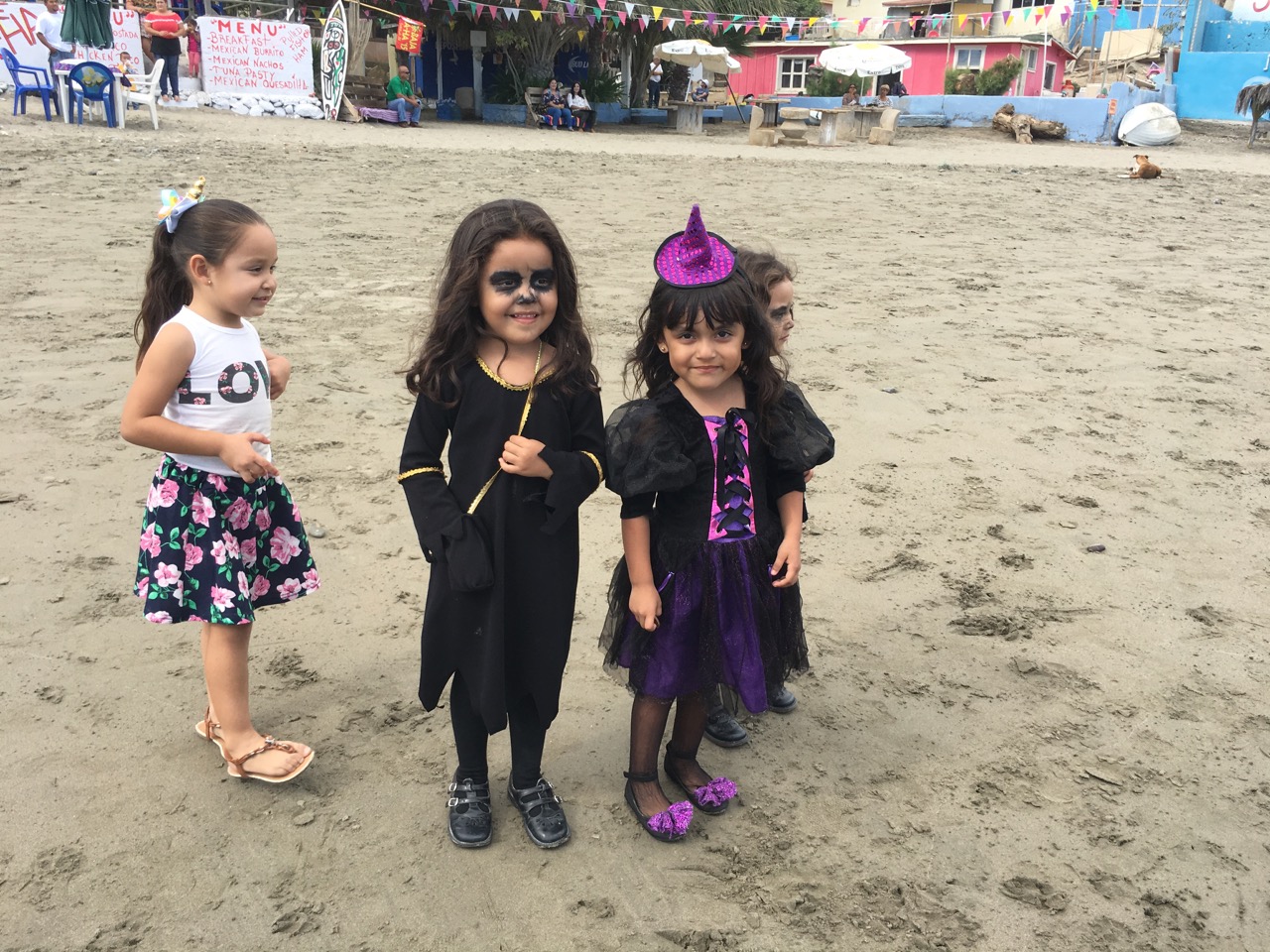 As we headed back to the beach from lunch, we were approached by four little girls in witch-like Halloween costumes, with black-and-white skeleton face paint. It seems that the arrival of the Baja here has slightly modified some of the local traditions. They celebrate parts of Día de los Muertos the second day of the Baja, at the beach party. The kids dress up, a la Halloween, and ask the cruisers for candy. (We are lame, and didn’t bring any to shore with us.) But, regardless of their costumes, they wear more traditional death-like face paint for Día de los Muertos. At the Baja Beach Party, I was approached by this cutie, dressed as Belle from Beauty and the Beast with deathly makeup, and asked for candy. (She knew that word in English quite well.) Due to our aforementioned lameness, I had to tell her I didn’t have any. So, she asked me for a photo. I took a photo of her with my phone, and she wanted to see it. I’m not sure she’d seen what she looked like in her costume and face paint, as she spent several seconds studying the photo before running off and asking other gringo party-goers for candy.