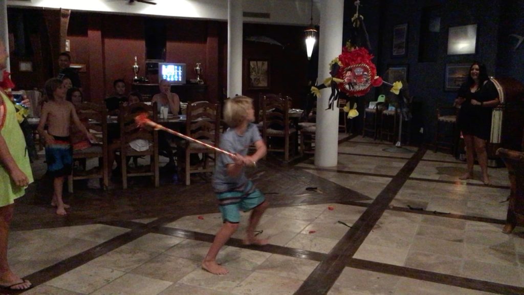 ‘Round about dinner time that day, a huge group of kids, and almost as many parents, swarmed the restaurant. There was a family living in the next town, Ventana, for six months during the winter, and the youngest in the family was turning six. So, what better place to have a birthday party that both the kids and parents would enjoy than at the Cave of Wonders? The mother of the birthday boy graciously invited our girls, as well as one other little 3-year-old girl staying at the nearby rental homes, to join the party, including the two piñatas, and cake. The girls had a complete blast, and were wiped at the end of the night.